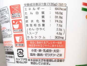 「トリプルチーズ豚骨ラーメン」のカロリーは1食135gあたり、647kcalです。