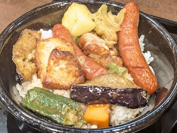 絶妙なスパイスの調合によるスープカレーをまとったキャベツ、じゃがいも、にんじん、オクラ、ナス、ローストチキン、そしてソーセージが、ご飯のおいしさをいっそう際立たせていました。